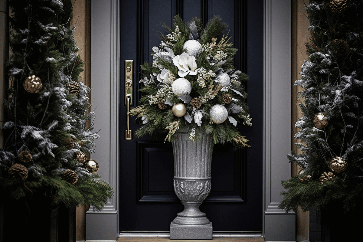 Add some greenery and festive accents to your front porch with decorative planters. Fill them with evergreen branches, pinecones, and holly berries for a classic Christmas look. You can also incorporate other seasonal elements like birch logs or winter flowers for a unique twist. Place them on either side of your door or line them along your porch steps for a stunning display.